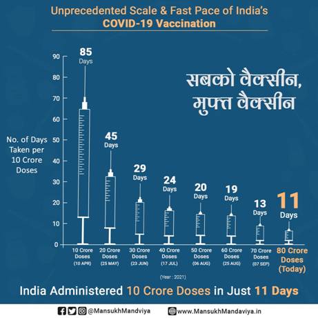 Union Health Minister Shri Mansukh Mandaviya congratulated the entire country and healthcare workers for the achievement of 80 Cr landmark milestone.The last 10 Cr COVID-19 Vaccine Doses were administered in just 11 days.