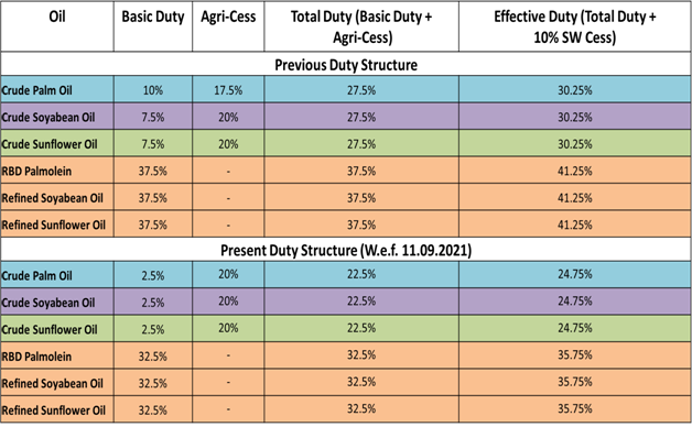 In order to ensure availability of edible oil to consumers at fair prices, Government of India, vide Notification No. 42/2021- Customs, dated 10th September 2021, has further reduced the standard rate of duty on Crude Palm Oil, Crude Soyabean oil and (i) Crude Sunflower Oil to 2.5% with effect from 11.09.2021 and (ii) the standard rate of duty on Refined Palm Oils, Refined Soyabean oil and Refined Sunflower Oil to 32.5% with effect from 11.09.2021.
