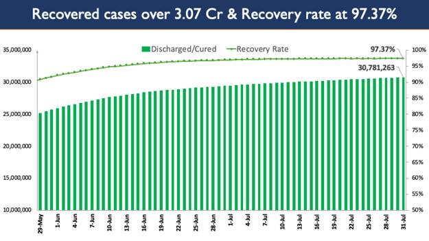 Out of the people infected since the beginning of the pandemic, 3,07,81,263 people have already recovered from COVID-19 and 37,291 patients have recovered in the last 24 hours. This constitutes an overall recovery rate of 97.37%.