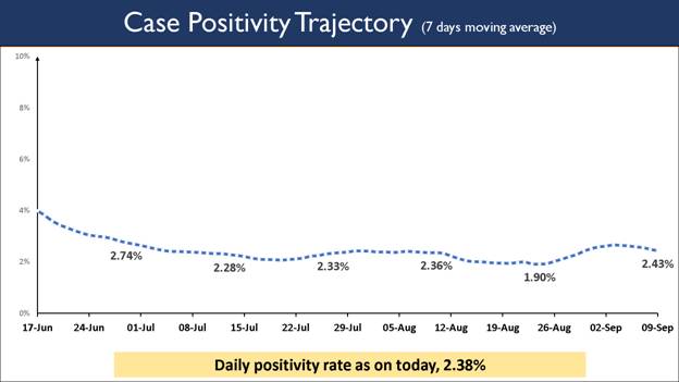 While testing capacity has been enhanced across the country, Weekly Positivity Rate at 2.43% remains less than 3% for the last 76 days now. The Daily Positivity rate reported to be 2.38%. The daily Positivity rate has remained below 3% for last 10 days and below 5% for 94 consecutive days now.