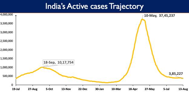 India’s Active Caseload today stands at 3,85,227. Active cases now constitute only 1.20% of the country’s total Positive Cases, which isthe lowest since March 2020.