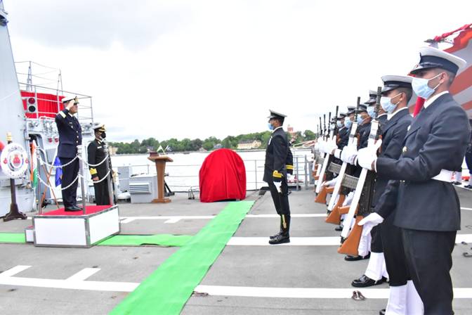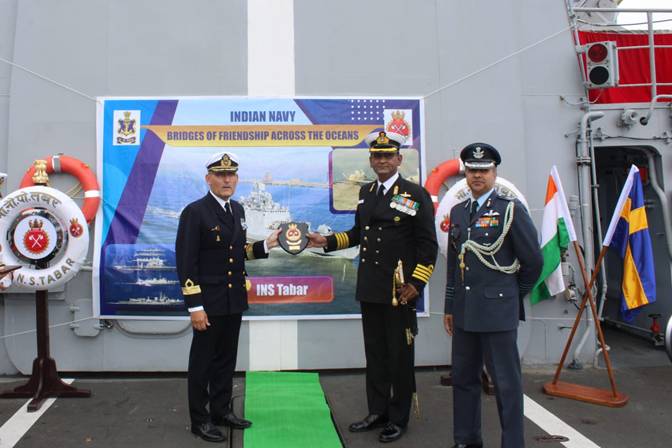 INS Tabar, as part of the ongoing Overseas Deployment, entered Port Stockholm on 30 Jul 21. This is the first visit of an Indian Navy Ship to Stockholm in nearly two decades. The ship was received by Brig Gen Peder Ohlsson, Deputy Chief of Royal Swedish Navy and Group Captain Pankaj Mittal, Indian DefenceAttache (DA) at Sweden. Subsequently,  Deputy Chief of Royal Swedish Navy visited the ship and was presented a Guard of Honour onboard. During the walk around, he was explained about the key functionalities of the ship.  While extending a warm welcome, he conveyed that Tabar visit to Stockholm would only consolidate the long standing ties between the Indian Navy and the Royal Swedish Navy. Captain Mahesh Mangipudi, the Commanding Officer (CO) presented him with the ship’s crest on completion of the visit.