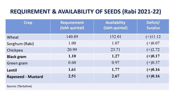 During Kharif 2021-22, 10.90 lakh seed minikits of pulses (Arhar, Urad and Moong) have been distributed and for Rabi 2021-22, a record number of seed minikits of Lentil i.e. 2.06 lakh have been allocated to the states. In case of Oilseeds, 2.14 lakh seed Minikits (Soybean, Groud Nut & Sesamum) have been distributed during Kharif 2021-22 and 8.67 lakh seed Minikits (Mustard, Ground Nut, Linseed & Safflower) have been allocated for Rabi 2021-22. These new HYVs seed minikits of Pulses & Oilseeds will reach the farmers and help in increasing productivity.