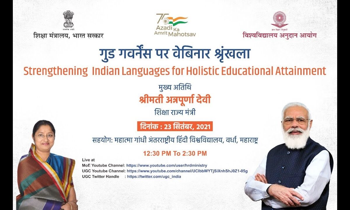 Ministry of Education and University Grants Commission organised a national webinar on Strengthening Indian Languages for Holistic Educational Attainment today, as part of the webinar series on Good Governance being held from 17th September, 2021 to 7th October, 2021. Minister of State for Education Smt. Annapurna Devi was the Chief Guest for the webinar.