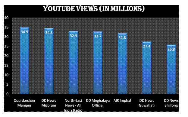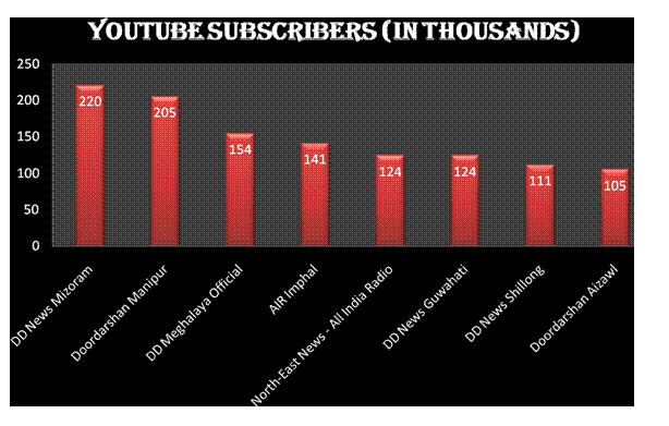 YouTube News channels of DD Mizoram, DD Guwahati, DD Shillong and All India Radio Northeast service have quite sizeable Subscribers base, with DD News Mizoram leading the pack.