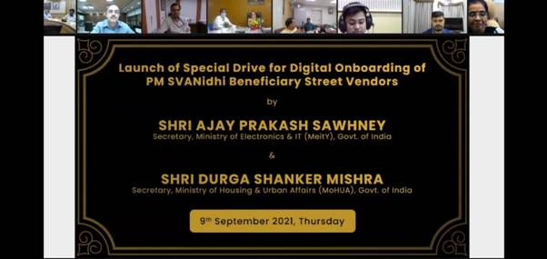 Pilot run of the ‘special drive for Digital onboarding of street vendors under PM SVANidhischeme’was launched today jointly by Shri Ajay Prakash Sawhney, Secretary, Ministry of Electronics & Information Technology(MeitY) and Shri DurgaShanker Mishra, Secretary, Ministry of Housing & Urban Affairs (MoHUA) in a virtual event. Senior officers from MeitY and MoHUA also attended the event virtually. The drive launched today is in line with Prime Minister Shri Narendra Modi’s vision of  “SabkaSaathSabkaVikas”.