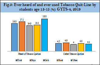 A total of 97,302 students from 987schools (Public-544; Private-443) participated in the survey. Of which, 80,772 students aged 13-15 years were considered for reporting.The objective of the survey was to provide information on tobacco use, cessation, second-hand smoke, access and availability, exposure to anti-tobacco information, awareness and receptivity to tobacco marketing, knowledge, and attitudes.