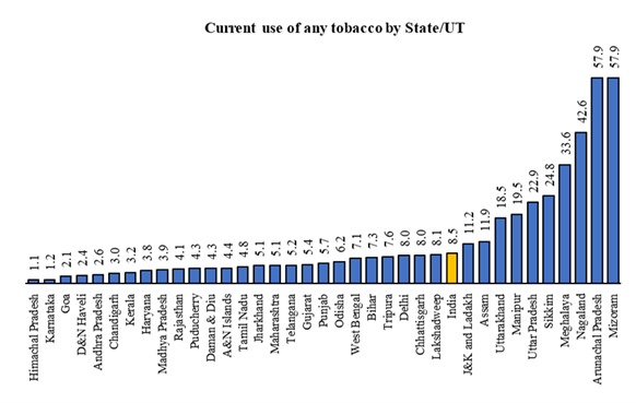 - The current use of tobacco among students across the States/ UTs ranged from the highest in Arunachal Pradesh and Mizoram (58% each) to the lowest in Himachal Pradesh (1.1%) and Karnataka (1.2%).