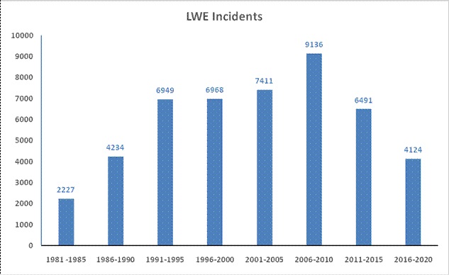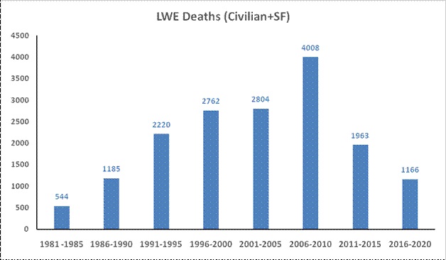 Over the last decade or so, there has been consistent decline both in the violence figure and its geographical spread. The incidents of LWE violence has come down by 70% from a all time high of 2258 in 2009 to 665 in 2020. The resultant deaths of has also come down by 82% from all time high of 1005 in 2010 to 183 in 2020. The area under Maoist’s influence was also constricted with the geographical spread shrunk from 96 in 2010 to just 53 districts in 2020. These miscreants have been pushed to a few pockets with only 25 districts accounting for 85% of the LWE violence in the country.